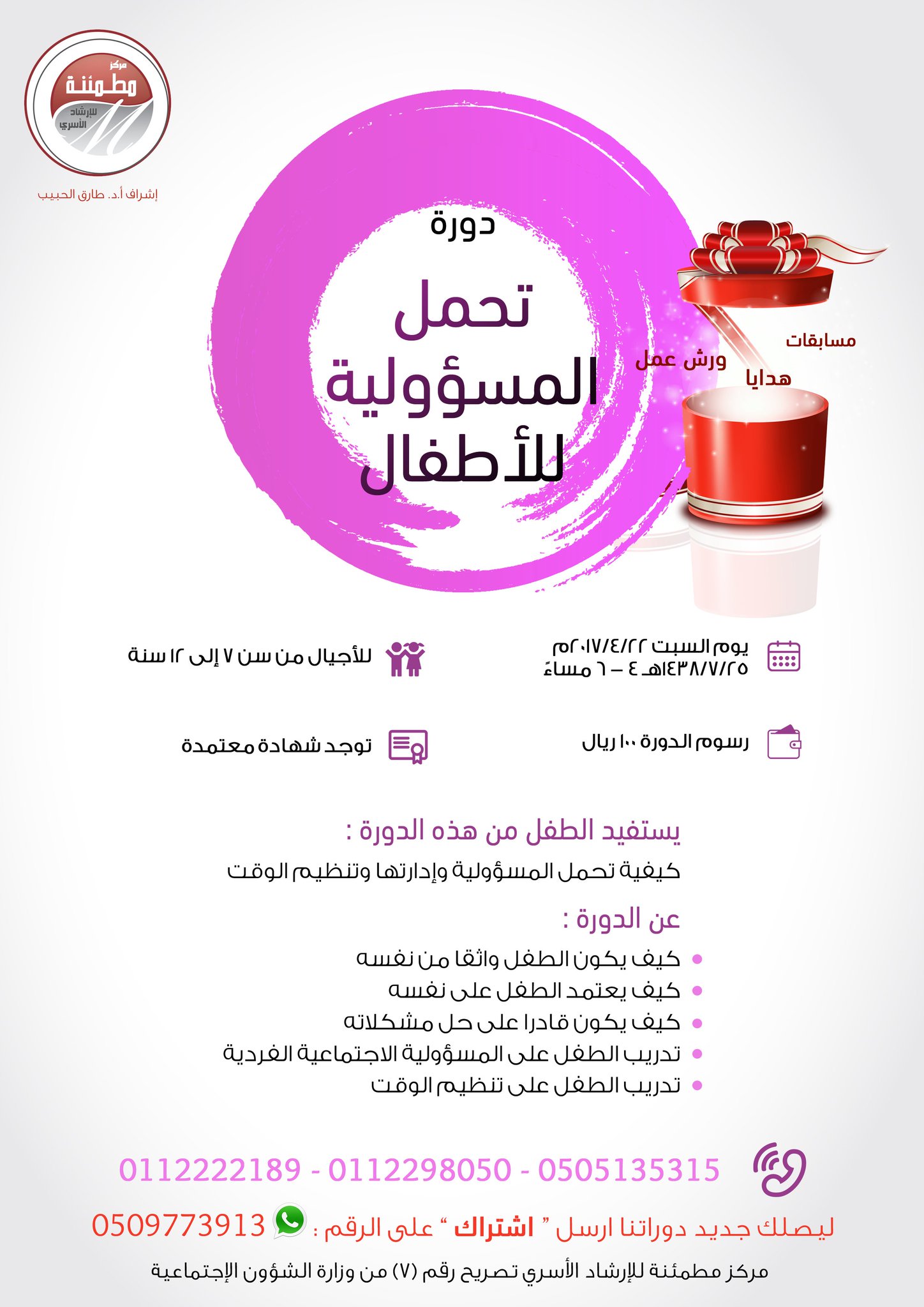 دورات مطمئنة No Twitter تقام في مطمئنة دورة بعنوان تحمل المسؤولية للأطفال تعرف كيف يكون الطفل واثقا من نفسه مع شهادة معتمدة