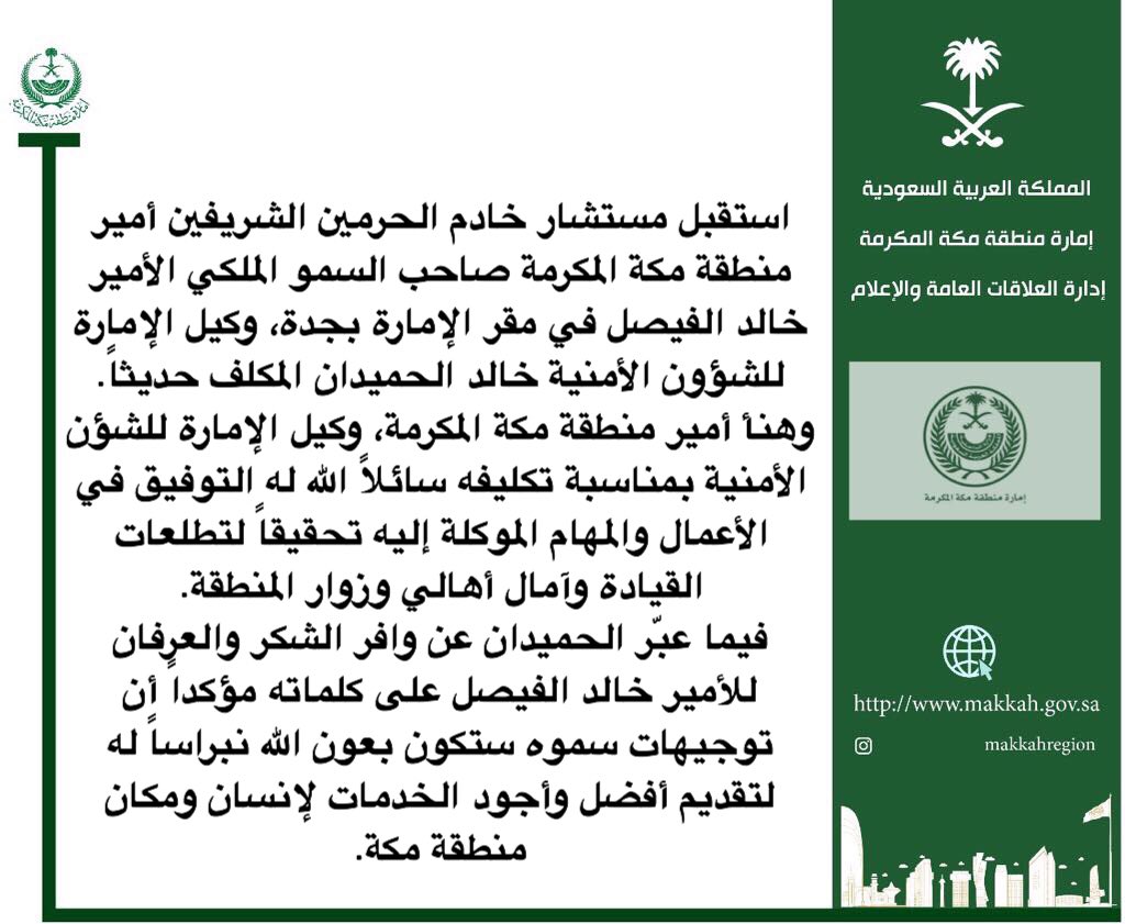 إمارة منطقة مكة On Twitter أمير مكة يستقبل وكيل الإمارة للشؤون الأمنية خالد الحميدان المكلف حديثا هنأه بمناسبة تكليفه سائلا الله له التوفيق في الأعمال والمهام الموكلة إليه تحقيقا لتطلعات القيادة وآمال أهالي