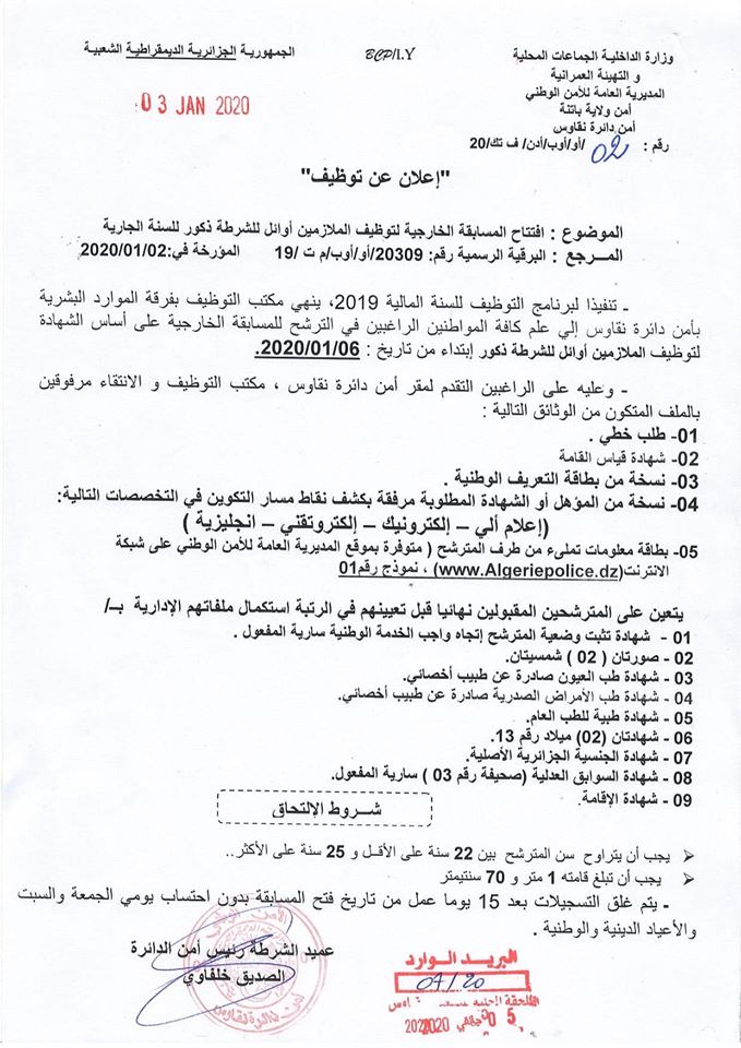 اعلان عن اعلان عن افتتاح المسابقة الخارجية لتوظيف الملازمین اوائل للشرطة ذكور